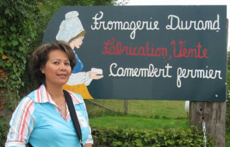 Phải qua những con đường làng nhỏ để đến làng Camembert. Một làng tổng cộng chỉ có 201 người, với diện tích khoảng 1000 mẫu đất (tây), tính trung bình, mỗi mét vuông có 19 người ở. Càng đi, đất làng càng rộng, nhà càng thưa, đường càng vắng. Xe chạy trên con đường đầy đặc cây cỏ hai bên, nhưng không có vẻ âm u… cũng có những con đường trần trụi đất ướt khô. Chưa đến thị xã Camembert mà tôi đã bị lạc đường. Dừng xe, vào gõ cửa một ngôi nhà nông dân để hỏi đường. Ông nông dân rắn chắc, khỏe mạnh in đậm trên thân thể, mở cưả với nụ cười niềm nở. Ông nhìn tôi như « cố tìm hiểu » . Ông khoảng chừng năm mươi tuổi mà đã có mái tóc « muối tiêu ». Ông nói : từ đây đến chỗ nông trại làm phó mát 38 cây số lận, đường ngoằn ngèo khó đi lắm ! Cô em biết uống rượu chát không ? Uống với « qua » một chén rồi « qua » sẽ đưa cô em đi. Tôi cười, bây giờ tôi mới có nụ cười yên tâm. Được mời « chén rượu lưu linh » như thấy xanh cả chân trời tím, trắng cả chân trời đá. Mái tóc bạc của ông ẩn hiện dưới nắng quê vừa hoang sơ vừa man dại… Ui ! chưa chi mà đã tận cùng cảm xúc rồi, nhưng có người dẫn đường thì còn lo gì ! Cảm ơn ông nông dân tốt bụng.
