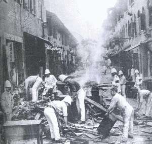 Các người tình nguyện đang tẩy uế nhà cửa khi dịch hạch đang hoành hành ở Hồng Kông năm 1894. BS Yersin đã sang Hongkong để nghiên cứu về dịch này ( photo, University of HongKong)